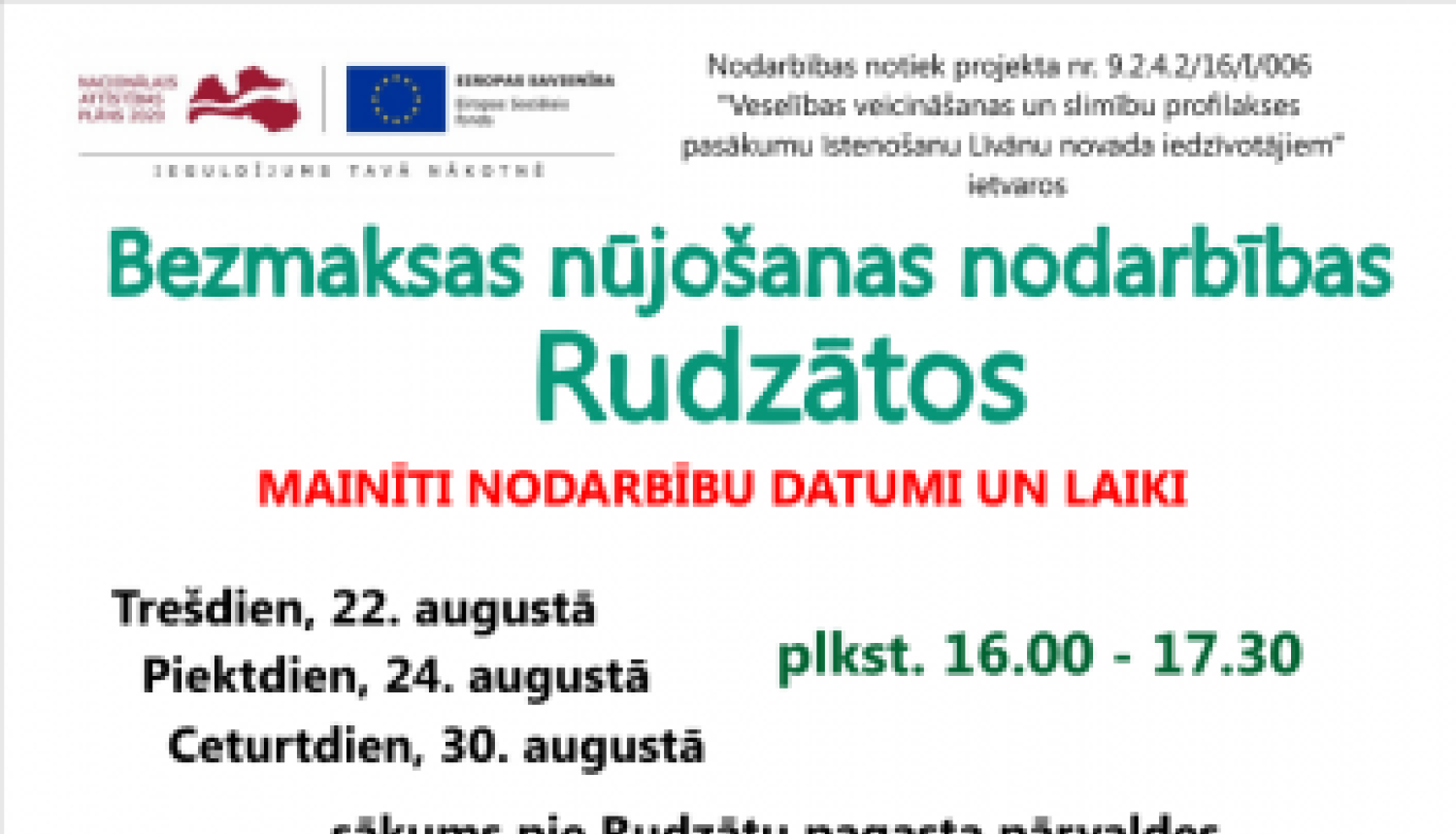 Augustā projekta nr. 9.2.4.2/16/I/006 „Veselības veicināšanas un slimību profilakses pasākumu īstenošana Līvānu novada iedzīvotājiem” ietvaros notiek nūjošanas nodarbības Rudzātos. Sākums pie Rudzātu pagasta pārvaldes, Mierā ielā 1.