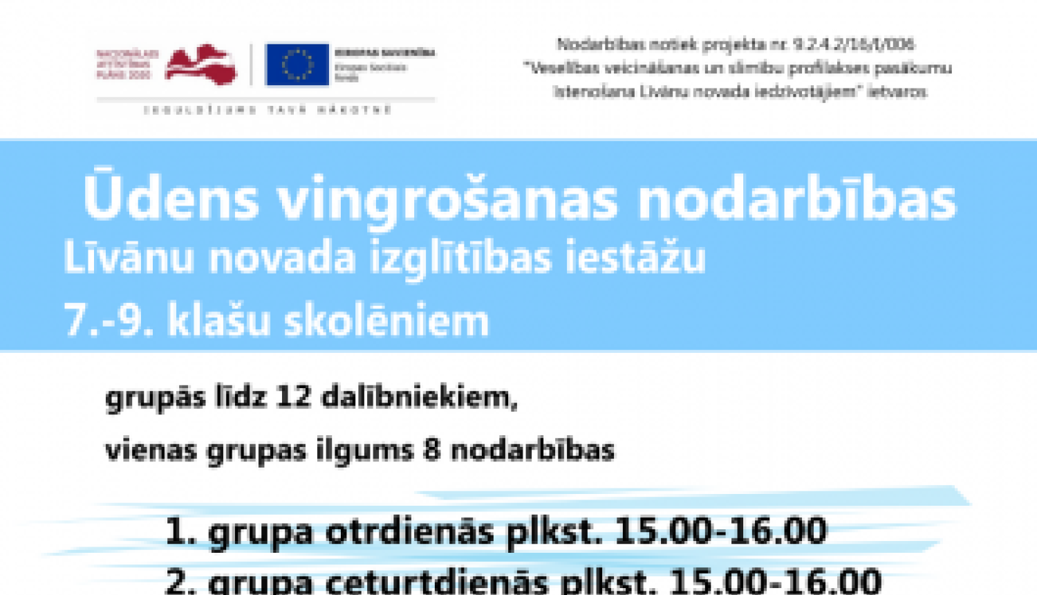No 15. janvāra otrdienās un ceturtdienās plkst. 15.00-16.00 notiks bezmaksas peldēšanas nodarbības Līvānu novada izglītības iestāžu 7.-9. klases skolēniem. Ūdens vingrošanu vadīs profesionāls peldēšanas treneris Indars Mucenieks no Jēkabpils. Lai nodarbības padarītu aizraujošākas bērniem, tiks izmantots peldēšanas inventārs (peldēšanas hanteles, nūdeles, pleznas, bumbas u.tml.) Nodarbības norisināsies grupās pa 12 bērniem. Vienas grupas ilgums ir 8 nodarbības.