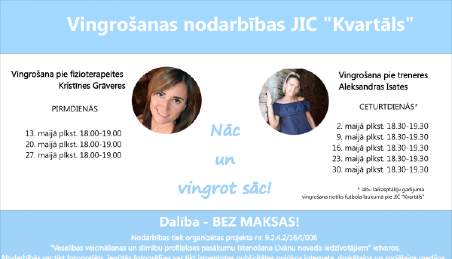Pirmdienās JIC “Kvartāls” telpās norisināsies bezmaksas vingrošana kopā ar fizioterapeiti Kristīni Grāveri. Pirmā nodarbība 13. maijā plkst. 18.00-19.00.