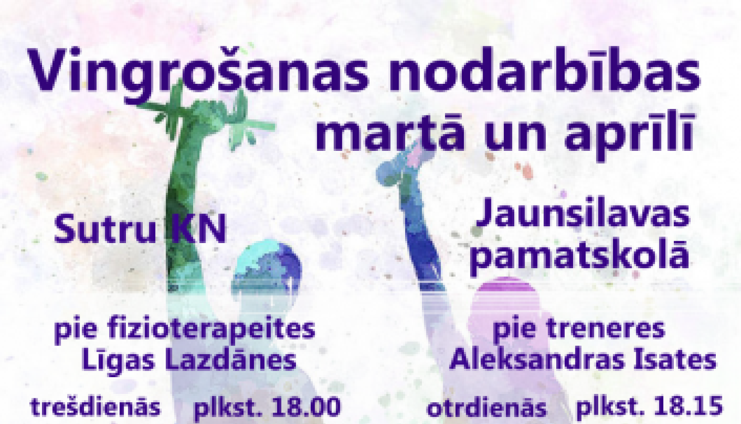 Jaunsilavas pamatskolas svinību zālē vingrošanas nodarbības notiks pie fitnesa treneres Aleksandras Isates. Nodarbību norises laiks: otrdienās no 5. marta līdz 23. aprīlim plkst. 18.15.