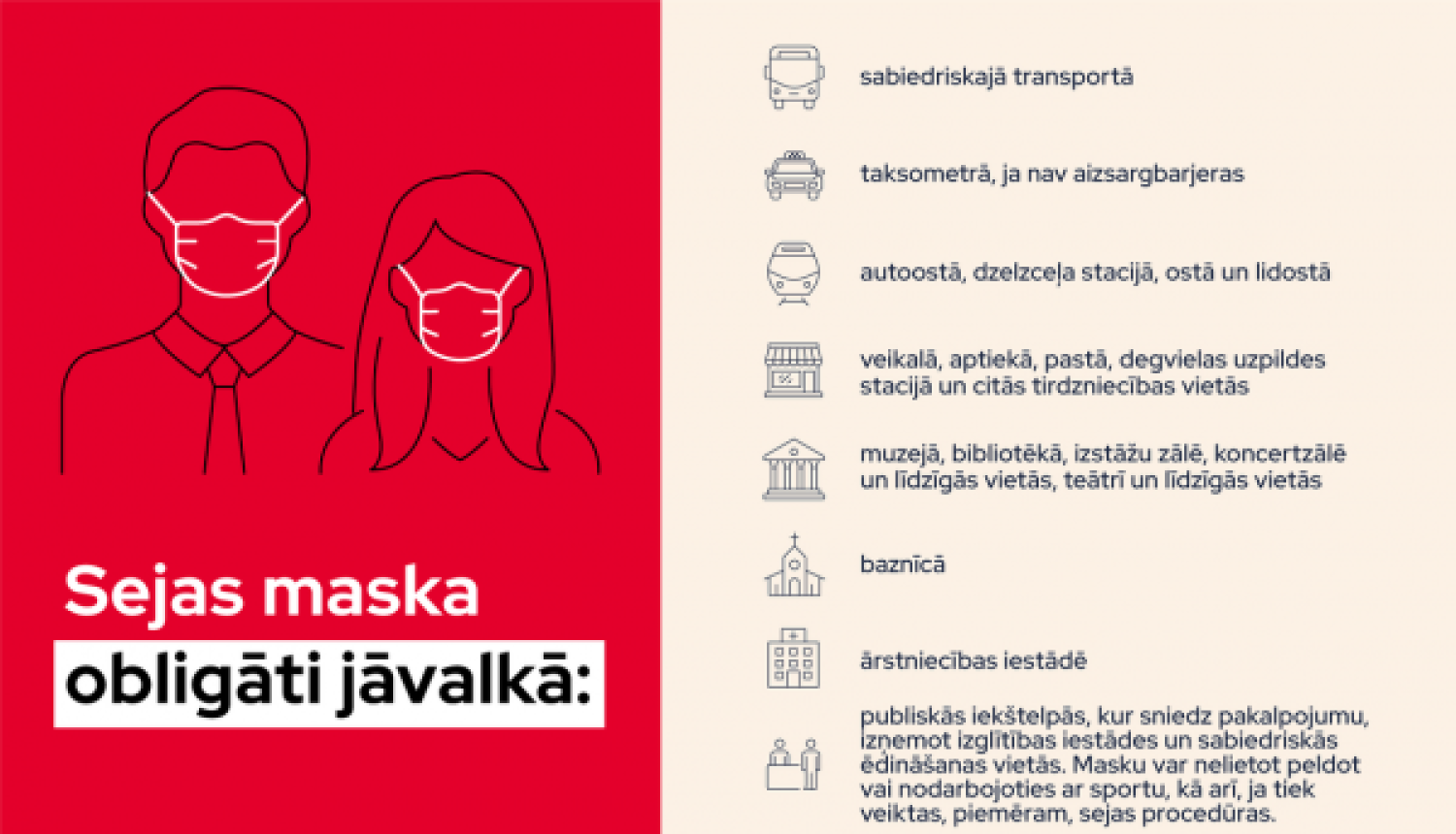 Privātos pasākumos, gan iekštelpās gan ārpus telpām, drīkstēs vienkopus pulcēties ne vairāk kā 10 cilvēki. Savukārt publiskos pasākumos kopā drīkstēs būt ne vairāk kā 300 cilvēki (gan iekštelpās, gan ārpus telpām). Turklāt tāpat kā līdz šim publiskās vietās iekštelpās, tai skaitā īrētās telpās, pasākumos cilvēkiem ir jābūt fiksētās, personalizētās sēdvietās un jāvalkā sejas maska.