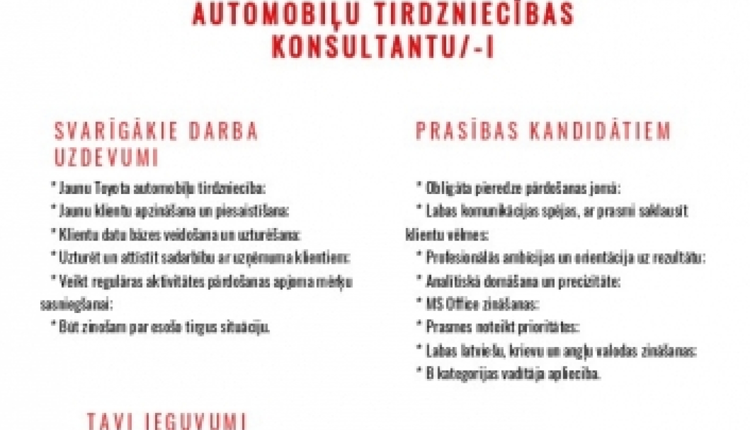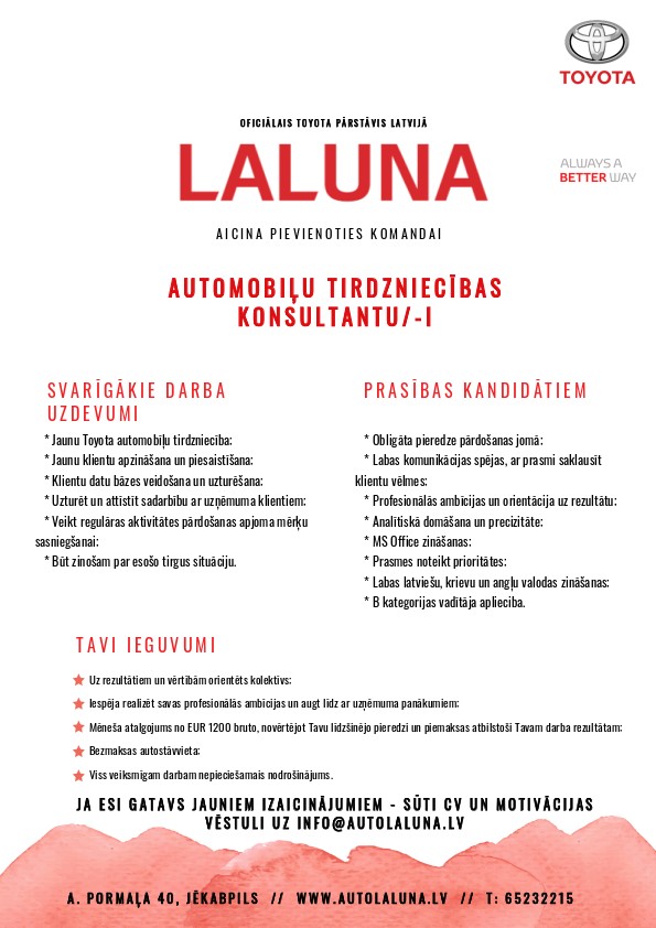 Oficiālais Toyota pārstāvis Latvijā LALUNA aicina pievienoties savai komandai automobiļu tirdzniecības konsultantu/i.