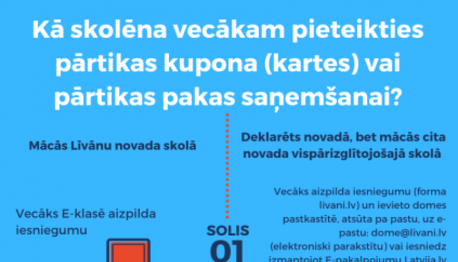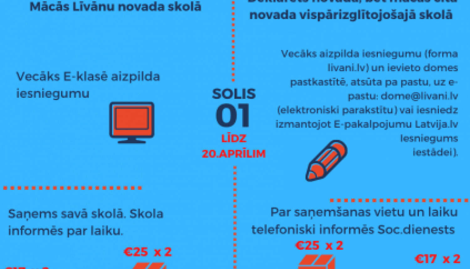 Atgādinām: pieteikums, kurš nosūtīts katra izglītojamā vecākam skolvadības sistēmā E-klase, ir jāaizpilda un jānosūta līdz 20. aprīlim! To ģimeņu likumiskie pārstāvji (vismaz vienam no likumiskajiem pārstāvjiem jābūt deklarētam Līvānu novadā), kuru bērni ir deklarēti Līvānu novadā, bet mācās citu novadu vispārizglītojošās skolās, aizpildītu iesniegumu (iesnieguma forma pieejama www.livani.lv – Izglītība – Atbalsts pārtikas iegādei) līdz 20.aprīlim) var ievietot Līvānu novada domes (Rīgas iela 77, Līvāni) vai attiecīgās pagasta pārvaldes pastkastītē, atsūtīt pa pastu vai elektroniski parakstītu uz e-pastu: dome@livani.lv vai iesniegt izmantojot E-pakalpojumu Latvija.lv Iesniegums iestādei).