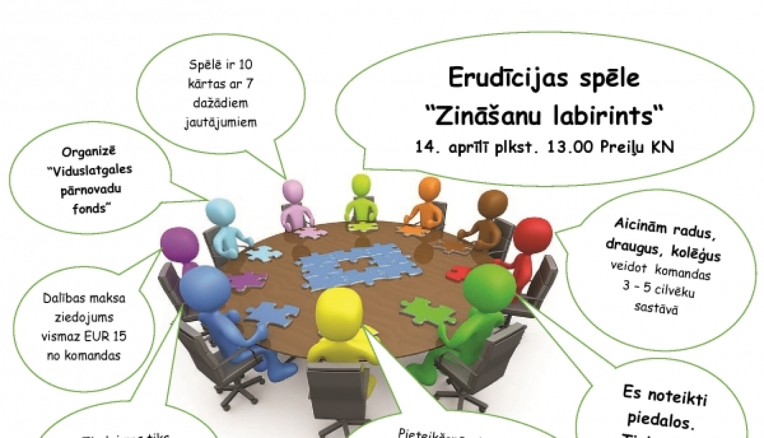 Viduslatgales pārnovadu fonds aicina veidot savas komandas un piedalīties erudīcijas spēlē "Zināšanu labirints", kura notiks 14. aprīlī plkst. 13.00 Preiļu Kultūras Namā. Aiciniet savus kolēģus radus, draugus un paziņas jauki pavadīt sestdienas pēcpusdienu.