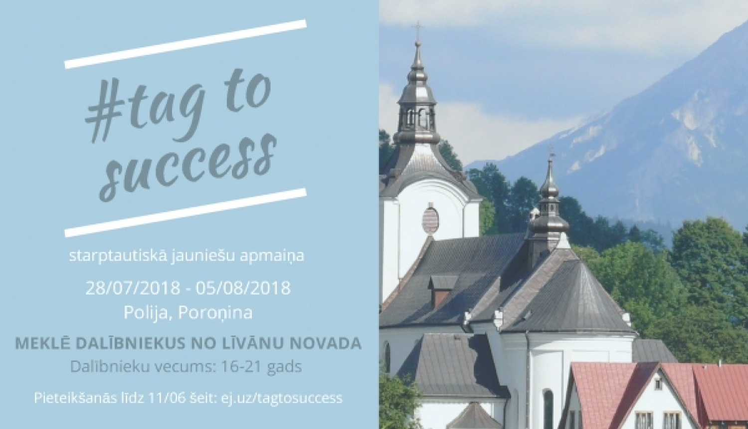 Līvānu novada Multifunkcionālais jaunatnes iniciatīvu centrs “Kvartāls” izsludina pieteikšanos starptautiskai jauniešu apmaiņai “#tag to success”, kas šovasar no 28. jūlija līdz 5. augustam norisināsies Polijas pilsētā Poroņinā. Pieteikšanās atvērta Līvānu novada jauniešiem vecumā no 16 līdz 21 gadam. Lai pieteiktos, līdz 11. jūnijam (ieskaitot) jāaizpilda pieteikuma anketu: