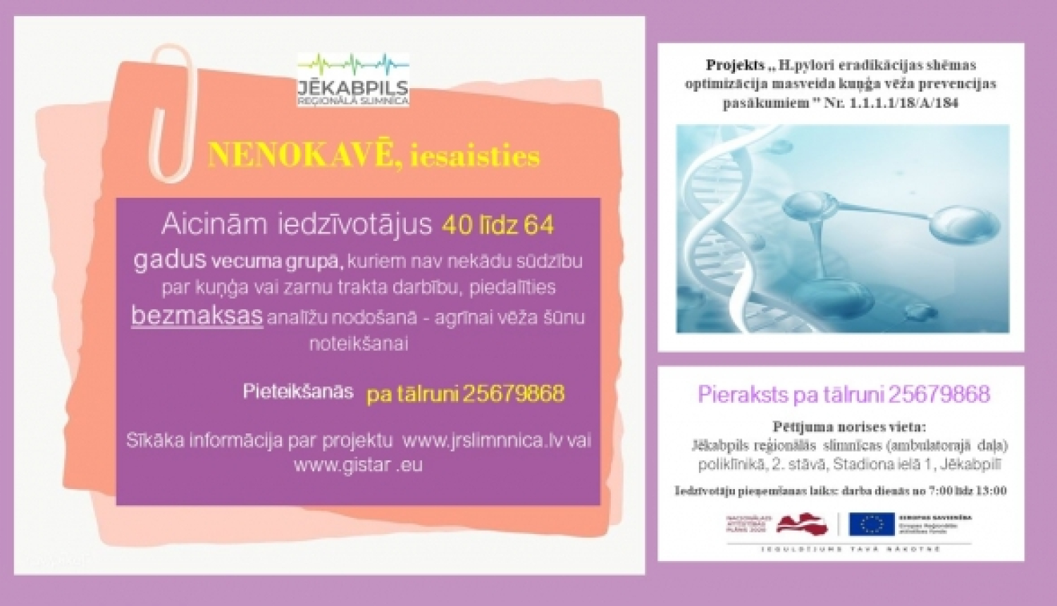 Jau vairāk kā pusgadu Jēkabpilī projekta “H.pylori eradikācijas shēmas optimizācijas masveida kunģa vēža prevencijas pasākumiem”, Nr.1.1.1.1/18/A/184 īstenošanas ietvaros savu darbību turpina gremošanas slimību profilakses pētījums – GISTAR.