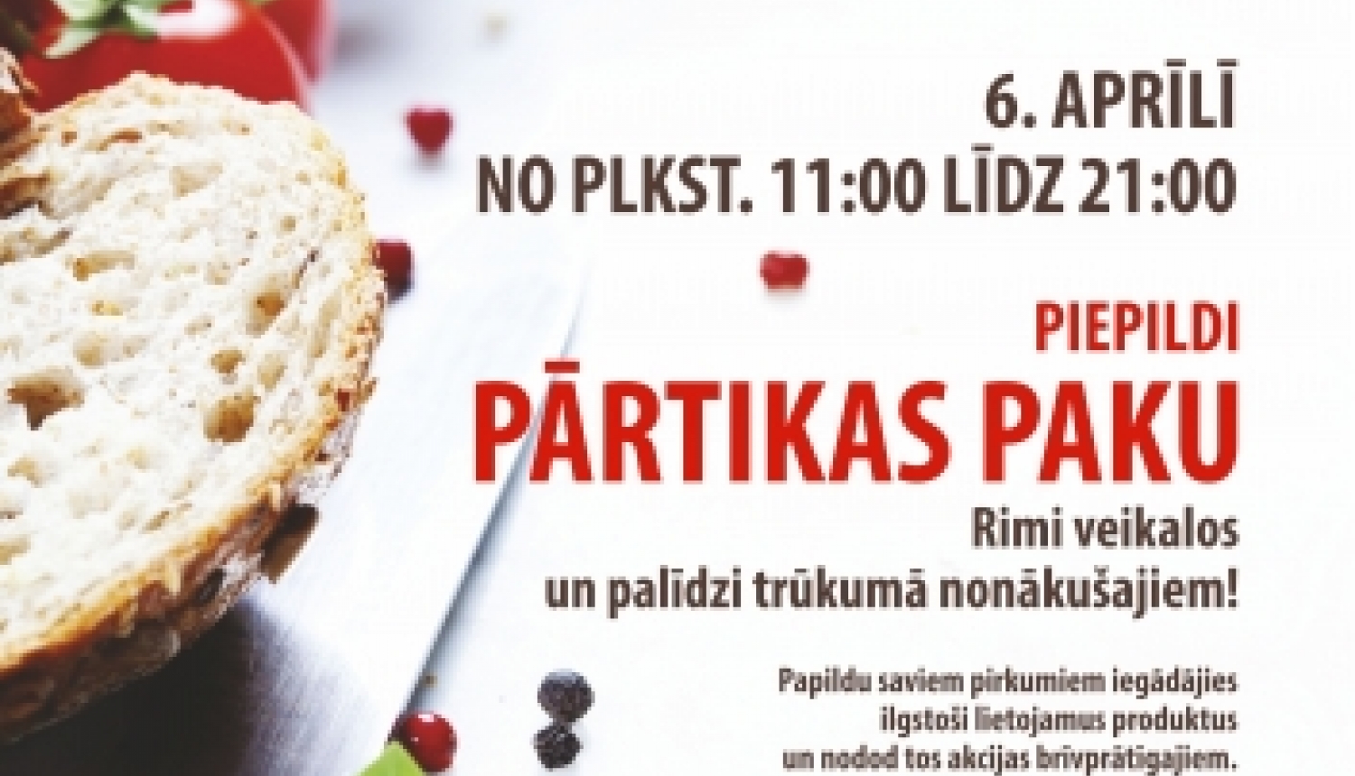 Sestdien, 6. aprīlī, no plkst. 11.00 līdz 21.00 Rimi veikalos Rīgā un citviet Latvijā jau septīto reizi norisināsies labdarības akcija “Paēdušai Latvijai”. Tās laikā ikviens aicināts papildu saviem ikdienas pirkumiem iegādāties produktus un piepildīt pārtikas paku, lai palīdzētu trūkumā nonākušajiem - ģimenēm ar bērniem, senioriem un personām ar invaliditāti.