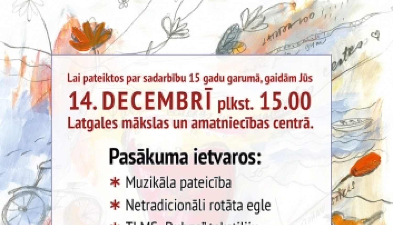 14.decembrī plkst.15:00 aicinām uz Latgales Mākslas un amatniecības centra 15 gadu pasākumu, kurš šoreiz īpaši veltīts centra dāvinātājiem, atbalstītājiem, sadarbības partneriem un draugiem.