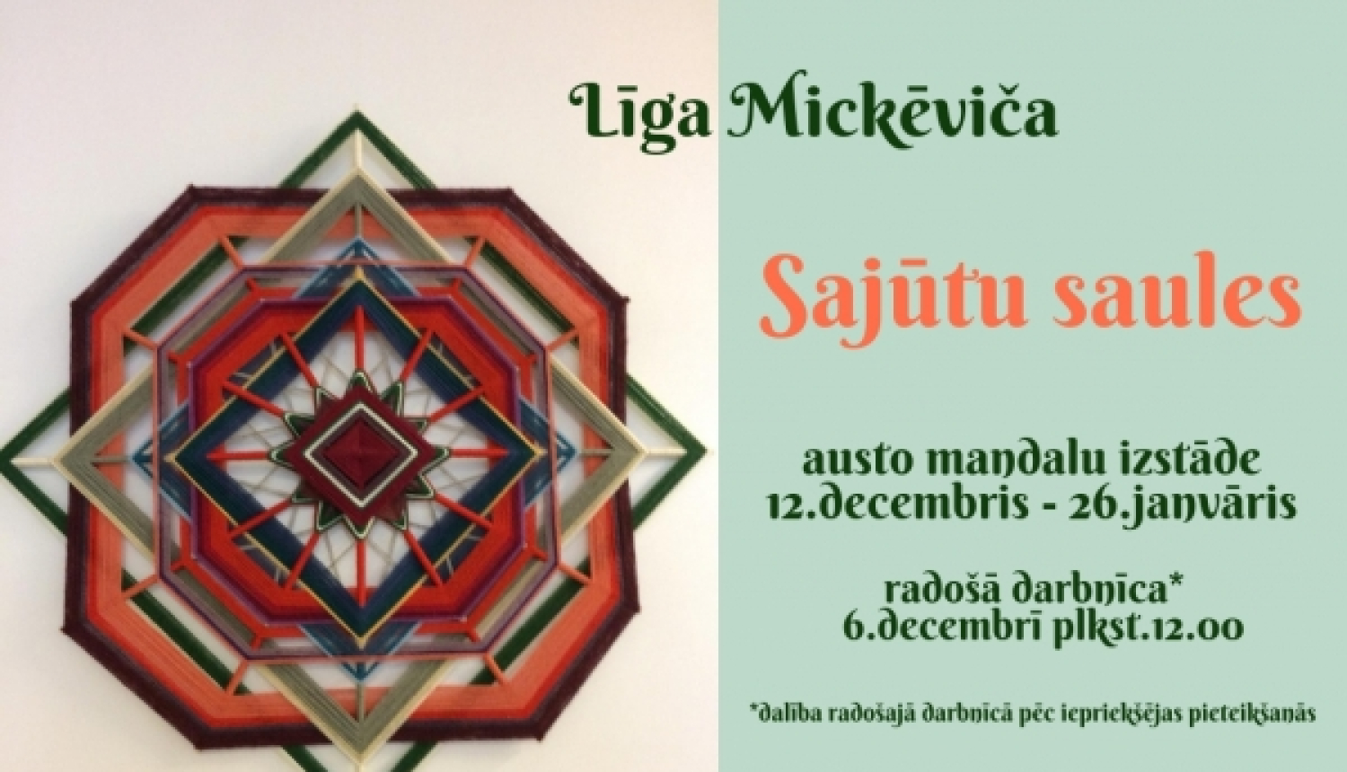 Aicinām apmeklēt Līgas Mickēvičas austo mandalu izstādi “Sajūtu saules”, kura būs apskatāma Latgales mākslas un amatniecības centrā no 2018.gada 12.decembra līdz 2019.gada 26.janvārim.
