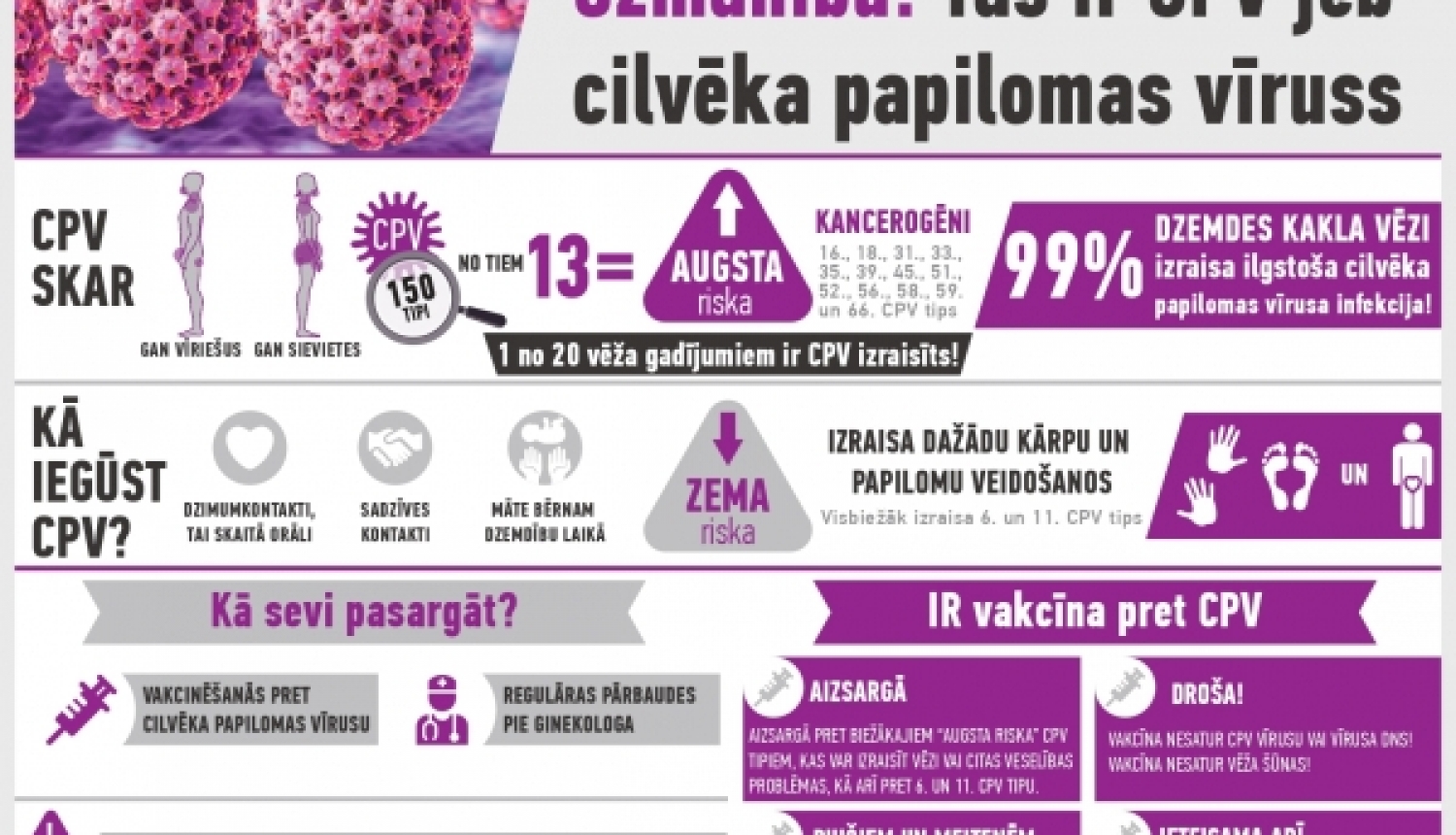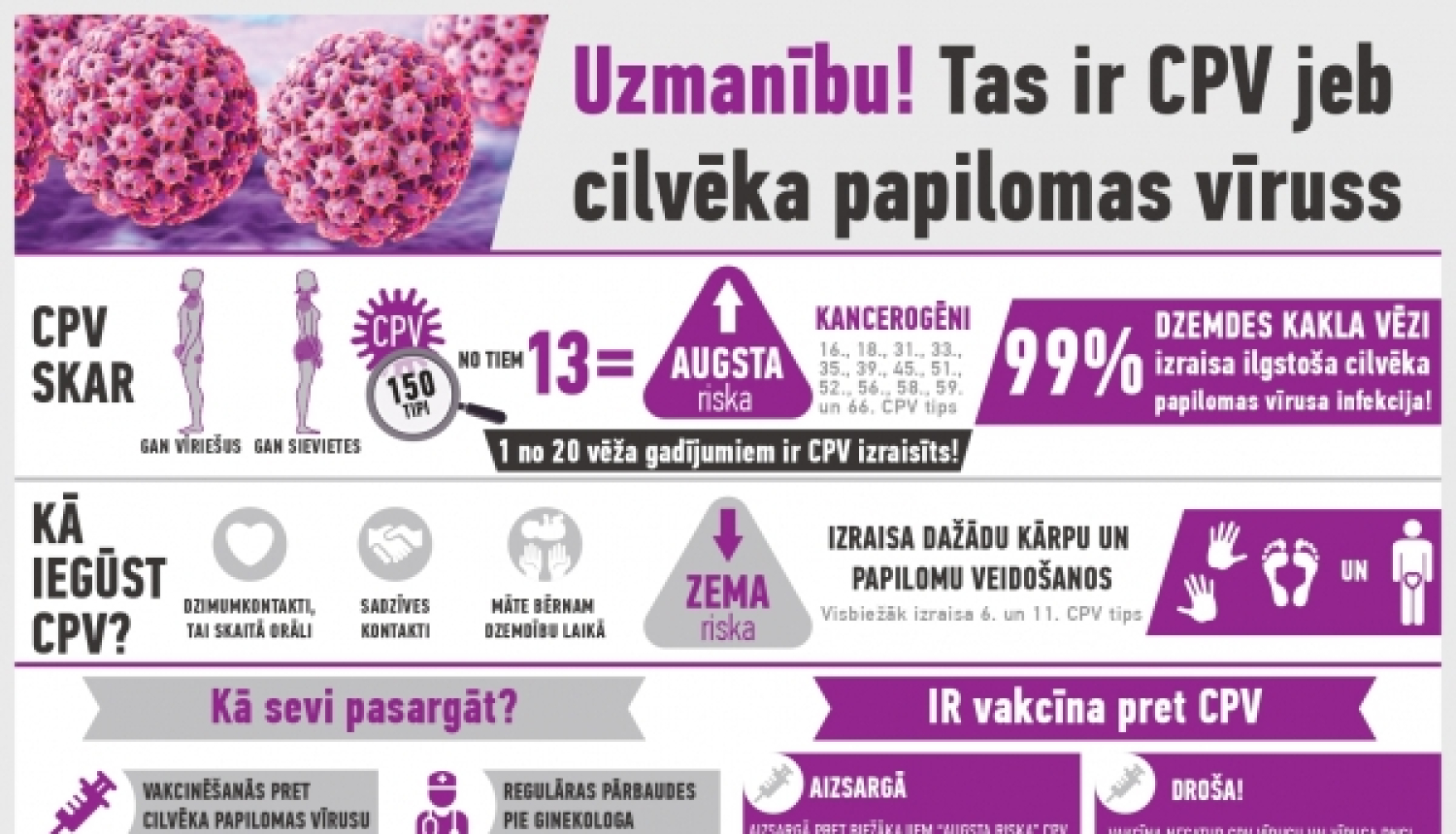 No 2020. gada janvāra Latvijā meitenēm no 12 gadu vecuma tiek apmaksāta 9-valentā vakcīna pret cilvēka papilomas vīrusu (CPV). Meitenes to var saņemt bez maksas ģimenes ārstu praksēs līdz pat 18. dzimšanas dienai. Šī pasaulē plaši un veiksmīgi lietotā vakcīna pasargā ne vien no dzemdes kakla vēža, bet arī citām ļaundabīgām un labdabīgām šī vīrusa izraisītām saslimšanām. Ik gadu Latvijā vidēji 500 cilvēkiem tiek konstatētas ar CPV saistītas onkoloģiskas slimības, tāpēc Latvijas Onkologu asociācija un Latvijas ginekologu un dzemdības speciālistu asociācija aicina vecākus būt atbildīgiem un izmantot valsts apmaksāto vakcināciju pret CPV.