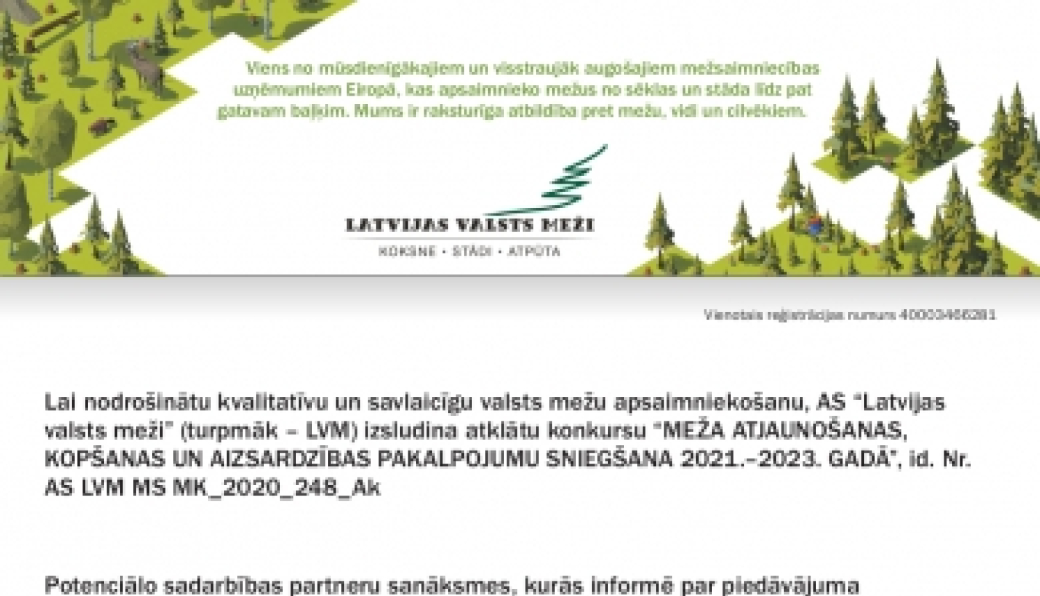 Lai nodrošinātu kvalitatīvu un savlaicīgu valsts mežu apsaimniekošanu, AS “Latvijas valsts meži” (turpmāk – LVM) izsludina atklātu konkursu “MEŽA ATJAUNOŠANAS, KOPŠANAS UN AIZSARDZĪBAS PAKALPOJUMU SNIEGŠANA 2021.–2023. GADĀ”, id. Nr. AS LVM MS MK_2020_248_Ak