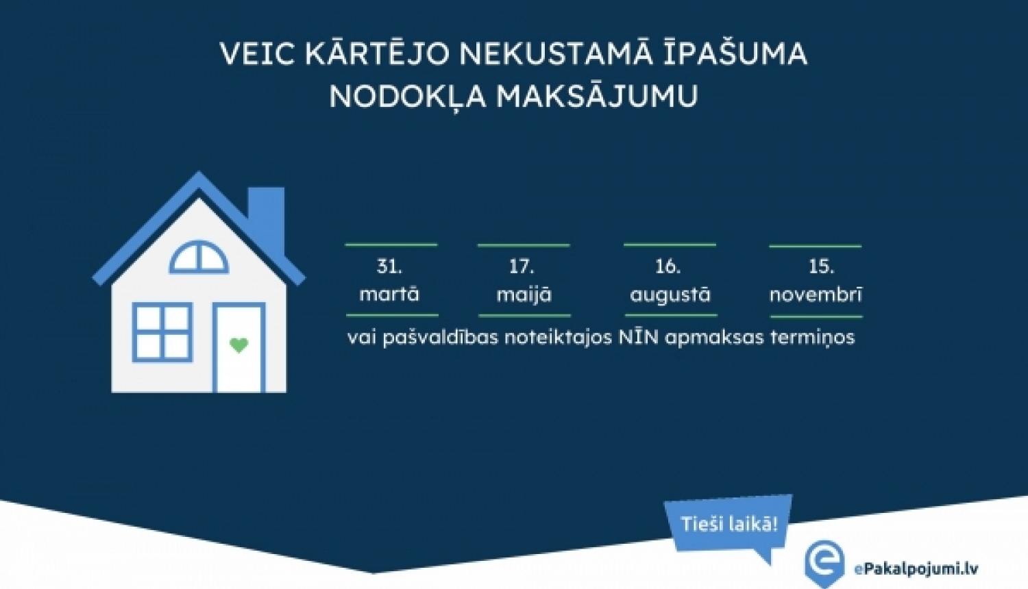 Atgādinām, ka līdz 2021. gada 31. martam veicams kārtējais nekustamā īpašuma nodokļa (NĪN) maksājums. Saskaņā ar likumu „Par nekustamā īpašuma nodokli”, nekustamā īpašuma nodokļa maksājumi veicami vienu reizi ceturksnī ne vēlāk kā 31. martā, 17. maijā, 16. augustā un 15. novembrī.