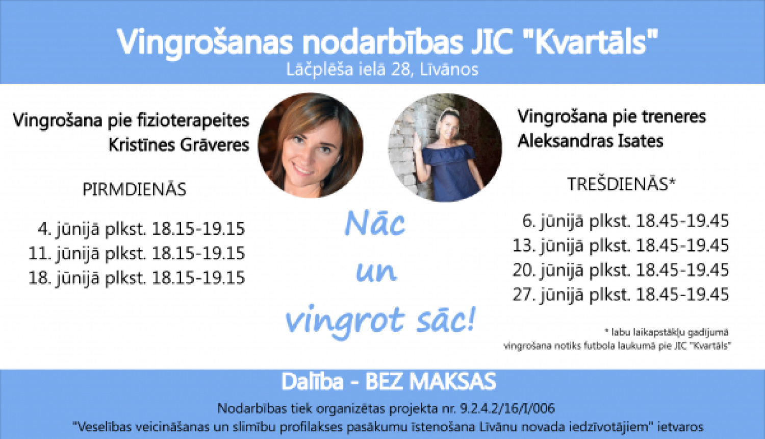 Jūnijā pirmdienās plkst. 18.15 – 19.15 vingrošanas nodarbības fizioterapeites Kristīnes Grāveres vadībā Līvānu novada Multifunkcionālajā jaunatnes iniciatīvu centrā  “Kvartāls” telpās 1. stāvā.
