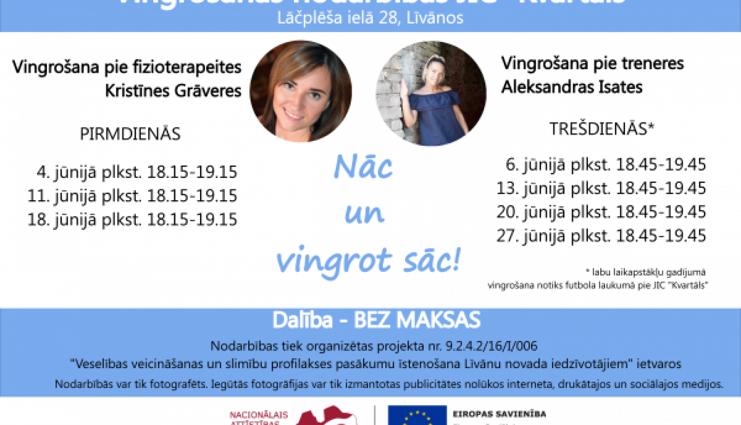 Jūnijā pirmdienās plkst. 18.15 – 19.15 vingrošanas nodarbības fizioterapeites Kristīnes Grāveres vadībā Līvānu novada Multifunkcionālajā jaunatnes iniciatīvu centrā “Kvartāls” telpās 1. stāvā.