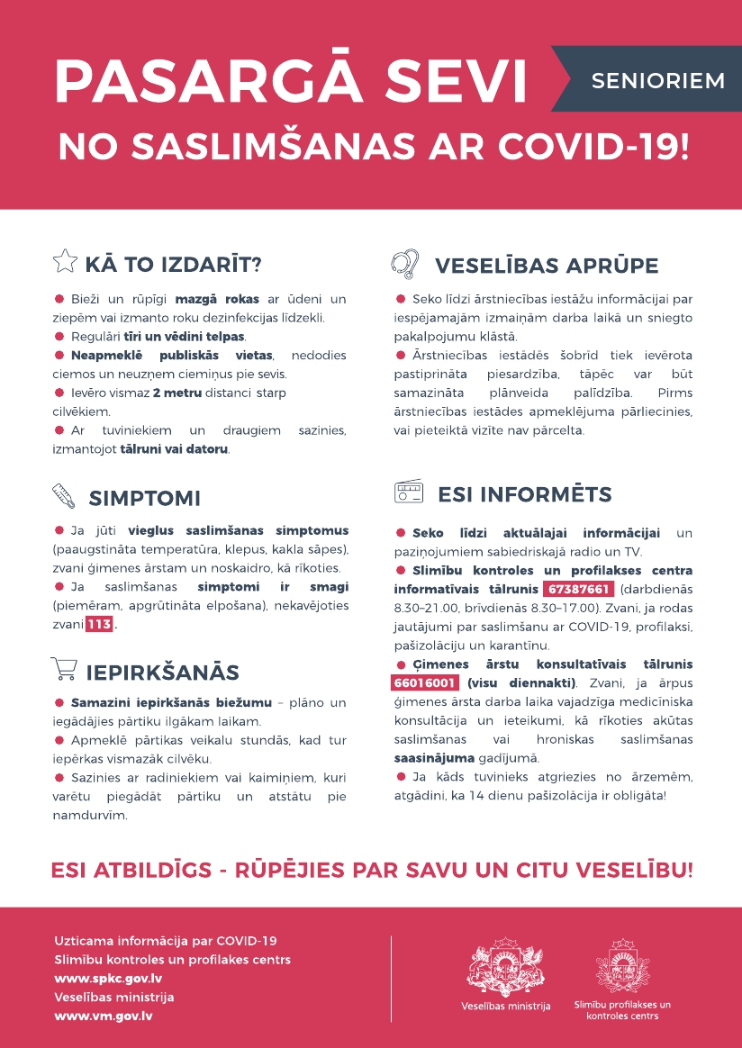 - Divu metru distanci no citiem cilvēkiem jeb sociālo distancēšanos ievērot vienmēr tajos gadījumos, kad tomēr nākas doties ārpus mājas.