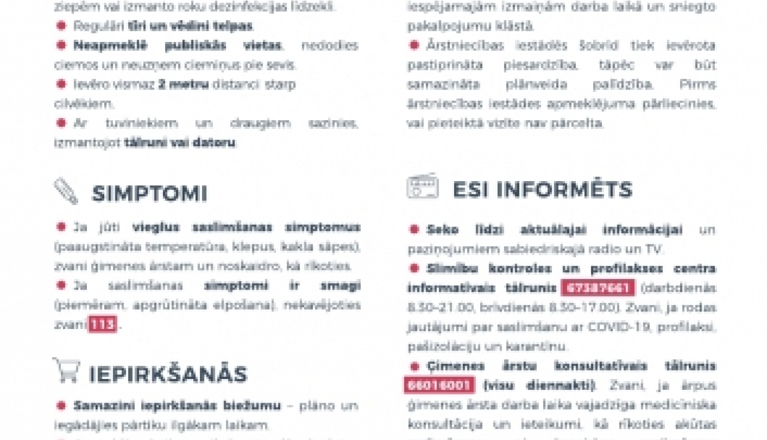 - Palikt mājās, ja tas ir iespējams, strādāt attālināti un atturēties no publisku vietu apmeklēšanas vispār vai darīt to tikai ārkārtējas nepieciešamības gadījumā;