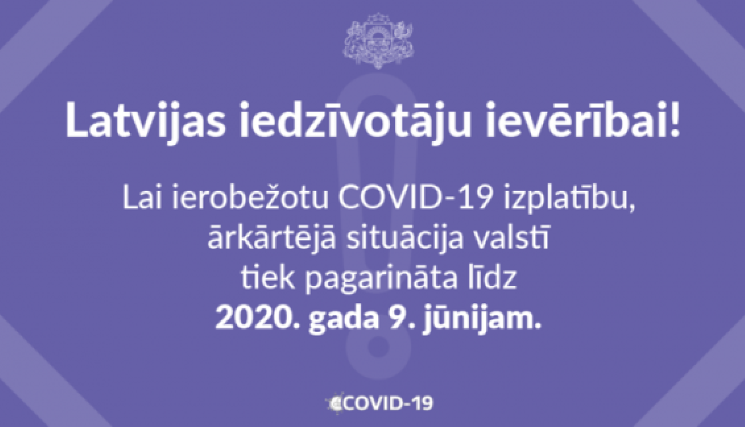Ceturtdien, 7. maijā, Ministru kabinets pagarināja ārkārtējo situāciju līdz 9. jūnijam, vienlaikus pieņemot lēmumu par pakāpenisku atsevišķu ierobežojumu atcelšanu vai samazināšanu. Obligāts priekšnoteikums šo ierobežojumu mazināšanai ir visu fiziskās distancēšanās un epidemioloģisko drošības pasākumu stingra ievērošana ikdienā visās jomās arī turpmāk.