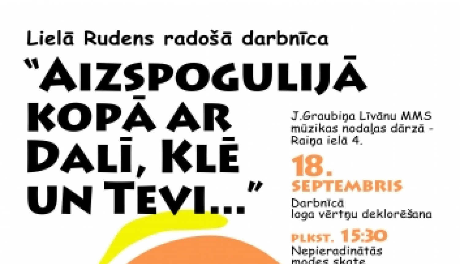 Radošā darbnīca notiks 2019. gada 18. septembrī Jēkaba Graubiņa Līvānu Mūzikas un mākslas skolas dārzā - Raiņa ielā 4.