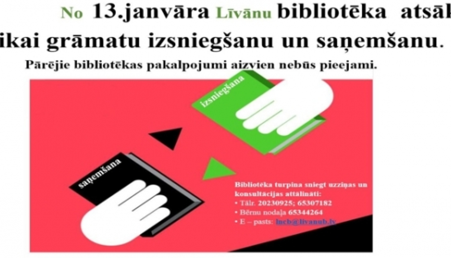 No 2021.gada 13.janvāra Līvānu bibliotēka atsāks tikai grāmatu izsniegšanu un saņemšanu.