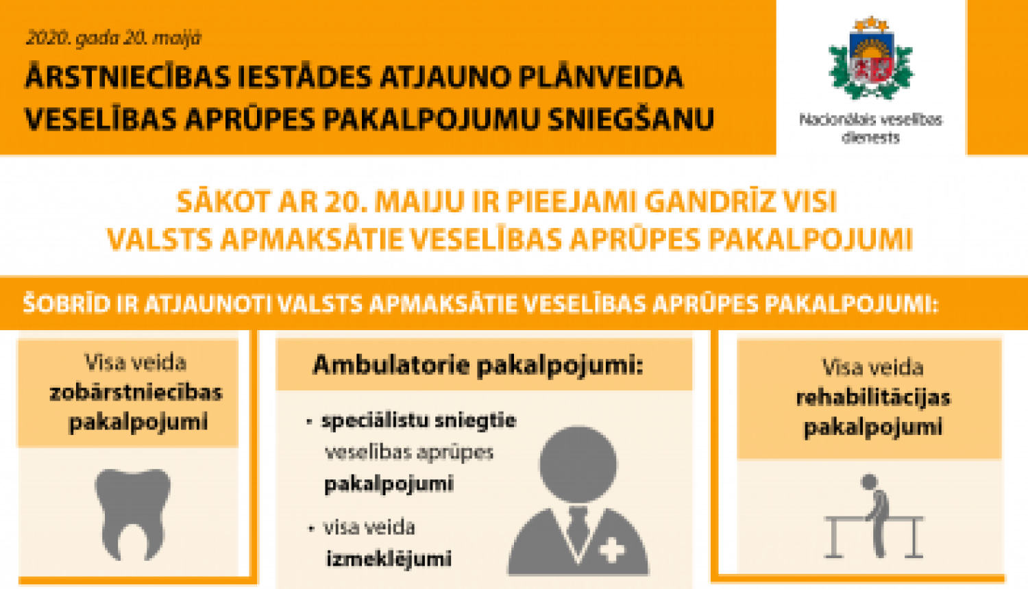 Nacionālais veselības dienests (NVD) informē, ka sākot ar 20.maiju pieejami gandrīz visi valsts apmaksātie plānveida ambulatorie veselības aprūpes pakalpojumi. Vēl pagaidām ierobežojumi saglabāti plānveida stacionāro pakalpojumu jomā un dienas stacionārā nav pieejamas plānveida operācijas, kas tiek veiktas, izmantojot vispārējo anestēziju (endotraheālo anestēziju vai laringeālo masku). Vienlaikus ārstniecības iestādēs tiek saglabātas stingras epidemioloģiskās drošības prasības, savukārt iedzīvotājiem, pirms došanās pie ārsta vai uz izmeklējumu joprojām spēkā iepriekšējā kārtība - iepriekš jāsazinās un jāvienojas par vizītes laiku un bez iepriekšēja pieraksta doties nedrīkst.