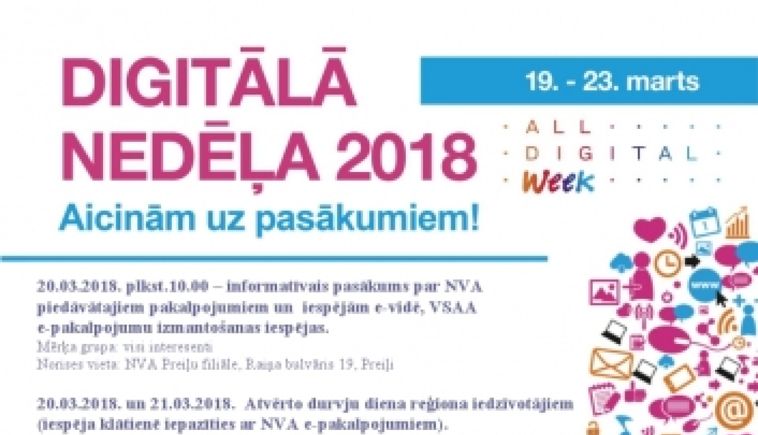 Plašāka informācija par “Digitālās nedēļas” pasākumiem un tiešraidēm pieejama tīmekļa vietnē www.eprasmes.lv. “Digitālā nedēļa” tiek organizēta Eiropas kampaņā “ALL Digital Week 2019”, kas Latvijā notiek jau desmito reizi. To organizē LIKTA sadarbībā ar VARAM. Pērn kampaņas laikā visā Latvijā tika organizēti 524 digitālajām prasmēm veltīti pasākumi, kuros piedalījās vairāk nekā 24 000 iedzīvotāju.