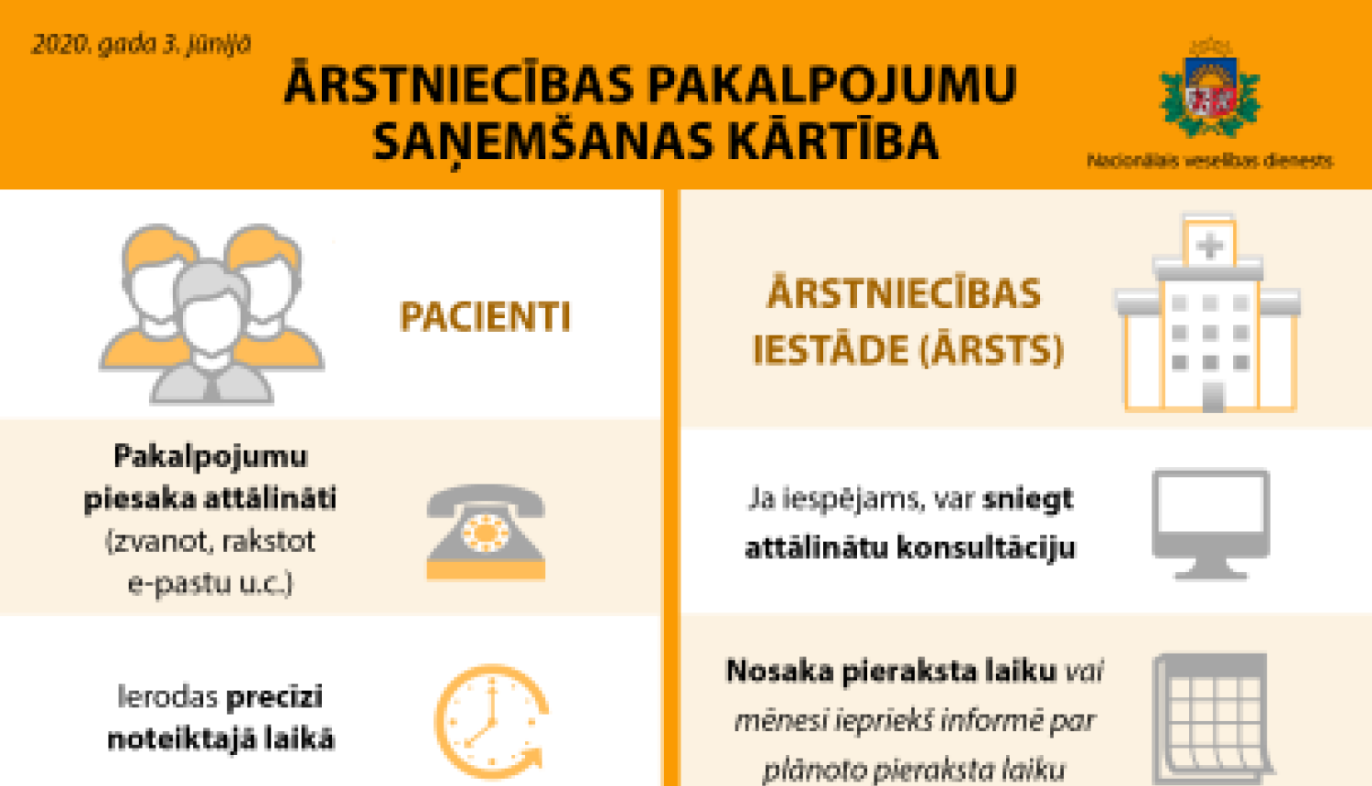 Neskatoties uz to, ka valsts apmaksāto veselības aprūpes pakalpojumu sniegšana ir pilnībā atjaunota, NVD atgādina, ka ārstniecības iestādēs pacientu apkalpošanas temps šobrīd ir ievērojami lēnāks nekā tas bijis iepriekš, jo līdz ar pakalpojumu atjaunošanu, ieviesti stingrāki piesardzības pasākumi.Vienlaikus ārstniecības iestādēm ir saglabāta iespēja sniegt attālinātas speciālistu konsultācijas.