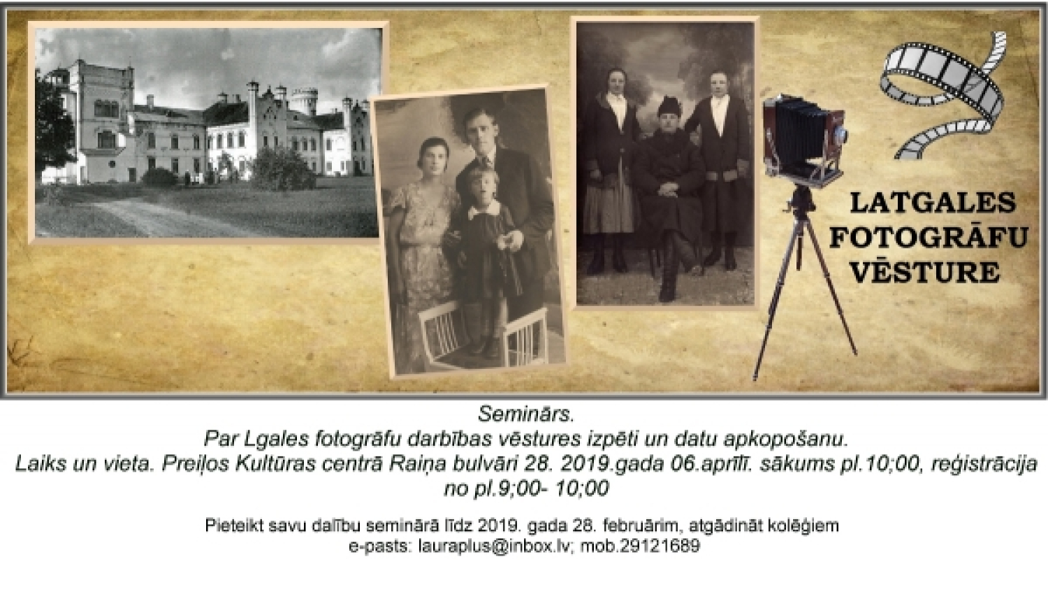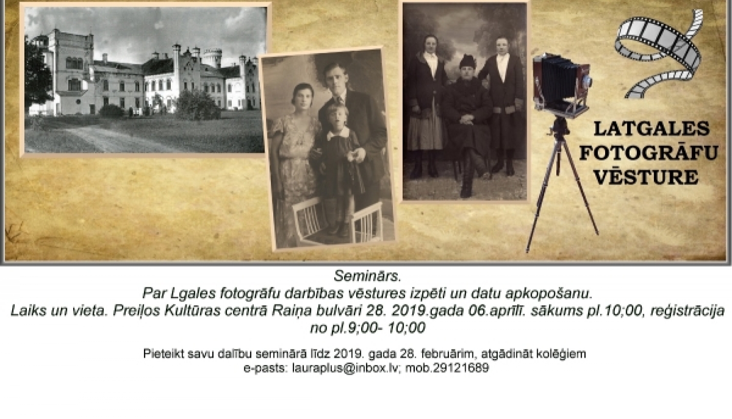 2019. gada 6. aprīlī 10.00 Preiļu novada Kultūras centrā (Raiņa bulvārī 28) notiks seminārs “Par Latgales fotogrāfu darbības vēstures izpēti un datu apkopošanu”.