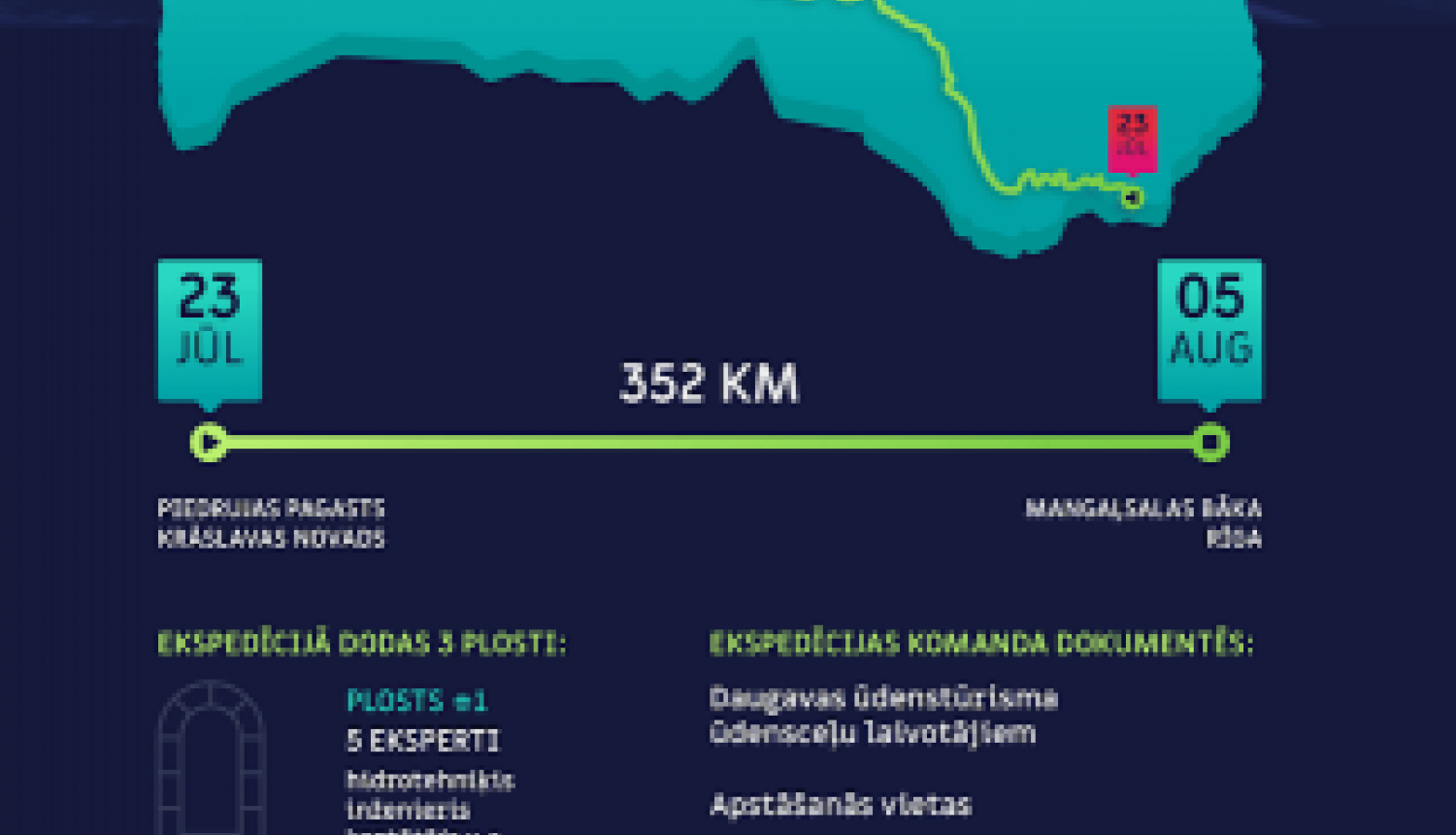No 23.jūlija līdz 5.augustam norisināsies vēl nepieredzēta Daugavas ūdenstūrisma maršruta izpētes ekspedīcija ar mērķi pirmo reizi izstrādāt publiski pieejamu, vienotu karti Latvijas lielākās upes ūdenstūrisma ceļam. Ekspedīcijā ar plostiem dosies 5 vides ekspertu komanda un 10 brīvprātīgie palīgi, mērojot ūdens ceļu no Daugavas augšteces Piedrujas pagastā, Krāslavas novadā, līdz Mangaļsalas bākai Rīgā, kopā veicot 352 kilometrus.