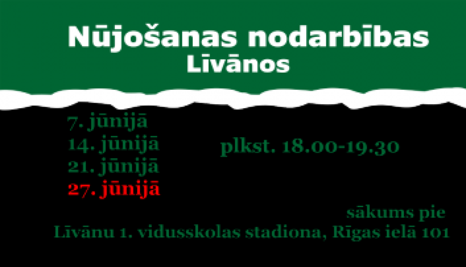 Ceturtdien, 27. jūnijā, plkst. 18.00-19.00 notiks nūjošanas nodarbība kopā ar nūjošanas treneri Andreju Bondarevu. Nodarbības sākums pie Līvānu 1. vidusskolas stadiona. Nūjošanas nūjas tiks nodrošinātas uz vietas.