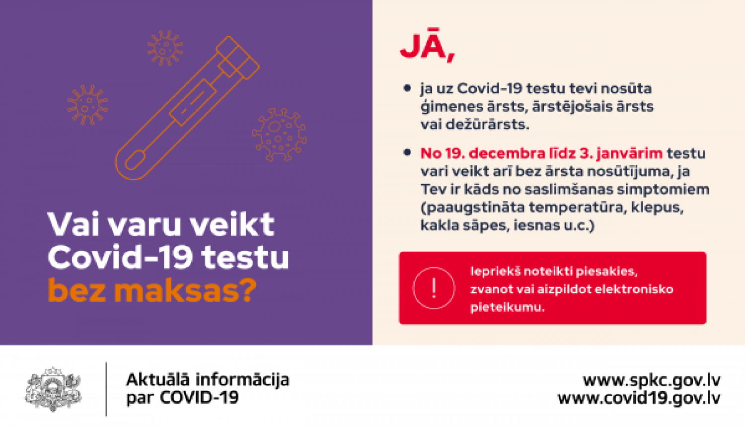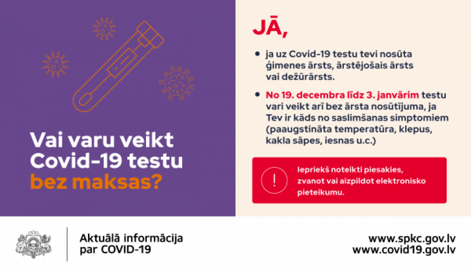 Sākot ar 19. decembri, līdz pat 3. janvārim iedzīvotājiem Covid-19 analīzes būs iespējams nodot arī bez ārsta nosūtījuma, ja ir parādījušies slimības simptomi (akūtas elpceļu infekcijas pazīmes, paaugstināta temperatūra, ožas traucējumi, garšas izjūtas zudums u.c.). Tas nodrošināts, lai saglabātu iedzīvotājiem iespēju brīvi nodot Covid-19 analīzes arī svētku laikā, kad saņemt ģimenes ārsta, ārsta speciālista vai dežūrārsta nosūtījumu analīžu veikšanai varētu būt apgrūtināti.