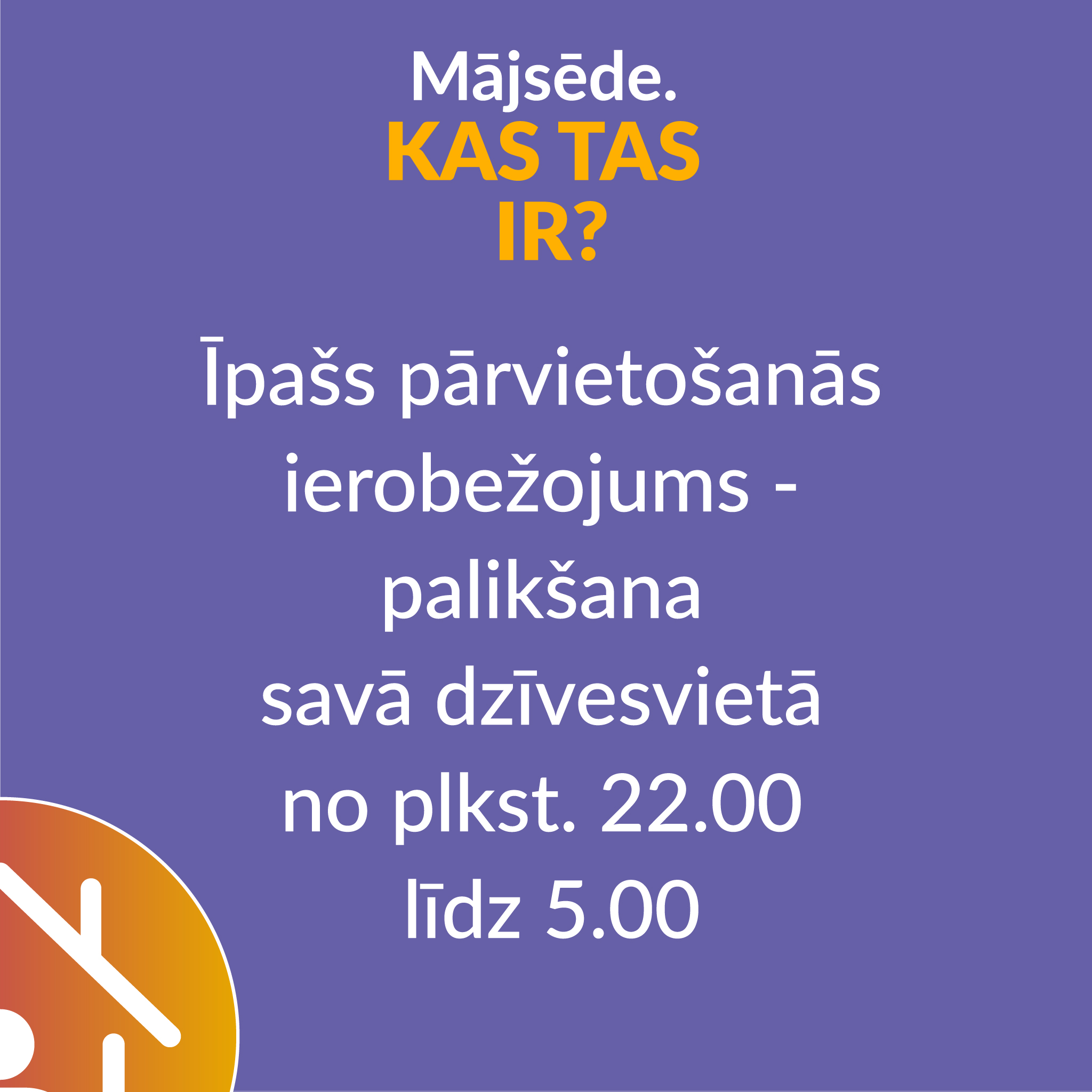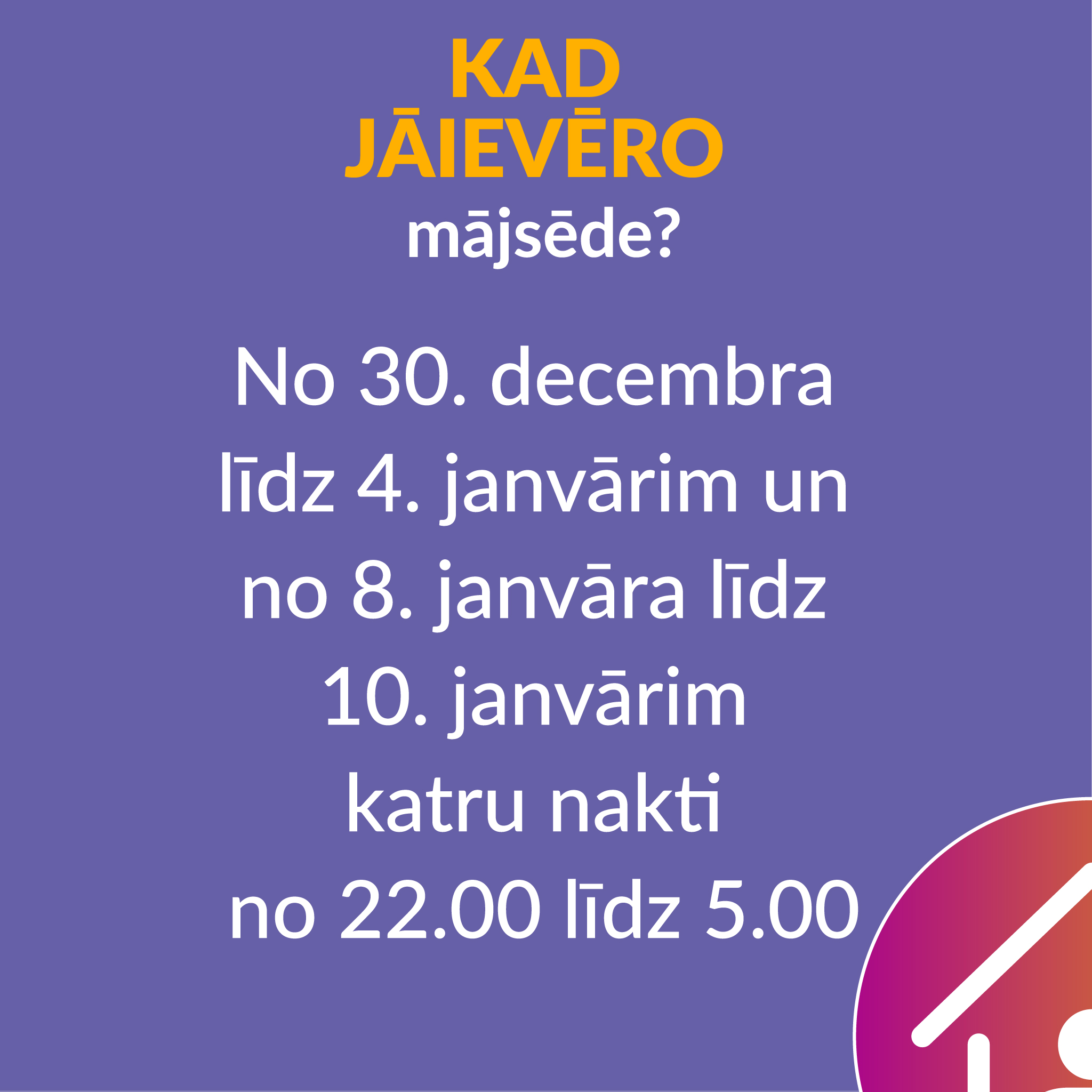 Trešdien, 30. decembrī, pieņemts lēmums par mājsēdi jeb iedzīvotāju pienākumu atrasties savās dzīvesvietās brīvdienās un svētku dienās laikā no plkst. 22.00 līdz 5.00. Šāds īpašs pārvietošanās aizliegums uz laiku ieviests, lai sargātu cilvēku veselību, mazinātu Covid-19 vīrusa izplatīšanos un mazinātu veselības aprūpes sistēmas pārslodzi.