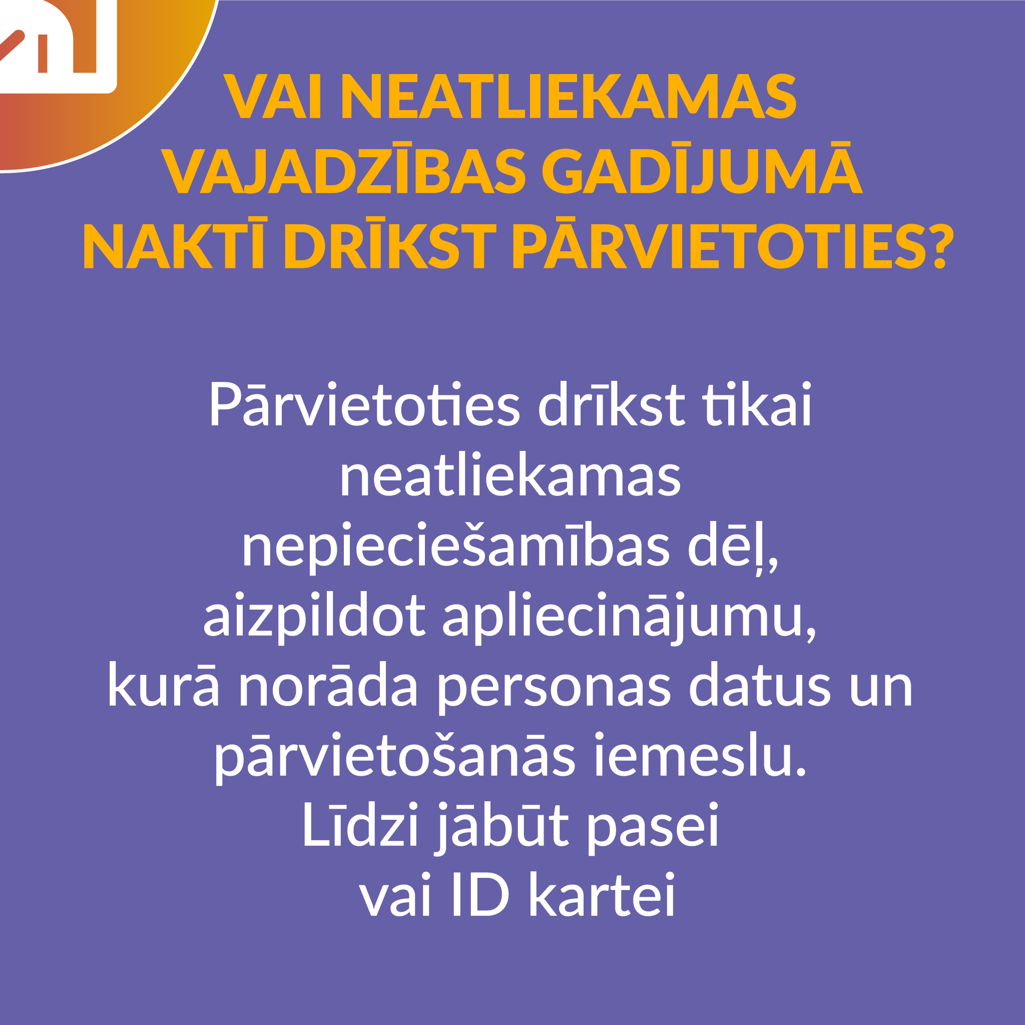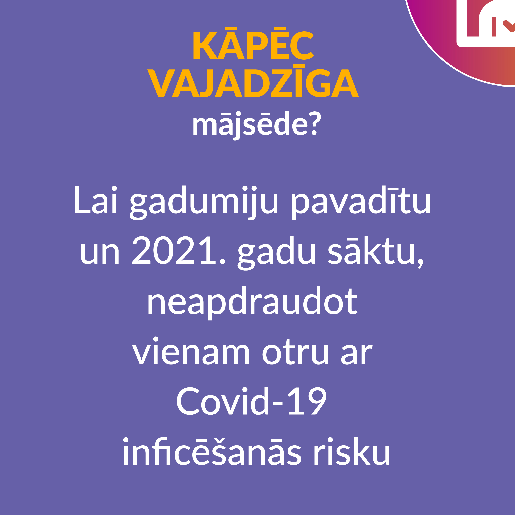 Lai mazinātu iespēju Covid-19 pastiprinātai izplatībai svētku laikā, Latvijas iedzīvotāji tiek aicināti palikt mājās, neuzņemt viesus un nedoties privātās vizītēs. Stingrākai kontrolei ir noteikts pārvietošanās ierobežojums brīvdienu un svētku dienu vakara un nakts stundām. No 2020. gada 30. decembra līdz 2021. gada 4. janvārim un no 8. janvāra līdz 10. janvārim laikā no plkst. 22.00 līdz 5.00 cilvēkiem jāievēro pienākums atrasties savā dzīvesvietā.