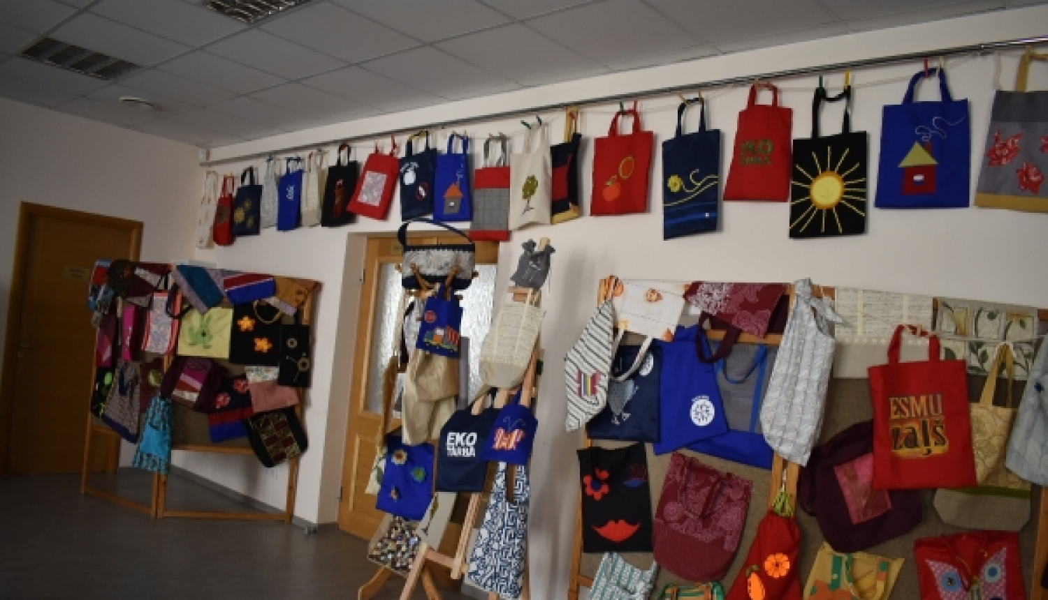 Nu sākās nākošā projekta aktivitāte- šūto auduma maisiņu izstāde “Eko tarba”, ar ko septembra mēnesī varēja iepazīties biedrības telpās. Izstāde bija koša, priecīga, visi darinājumi bija rūpīgi, varētu pat teikt – profesionāli, sašūti. Izstādes apmeklētāji priecājās ne vien par skaisti paveikto darbu, bet arī guva informāciju par plastmasas maisiņu un citu sadzīves atkritumu kaitīgo, milzīgu apjomu ietekmi uz mūsu dabu, tās resursiem. Izpildot darba lapu, varēja uzzināt, ka plastmasas pudeles sadalās tikai 500 gadu laikā, savukārt bērnu autiņbiksītes tikai 800 gadu laikā.