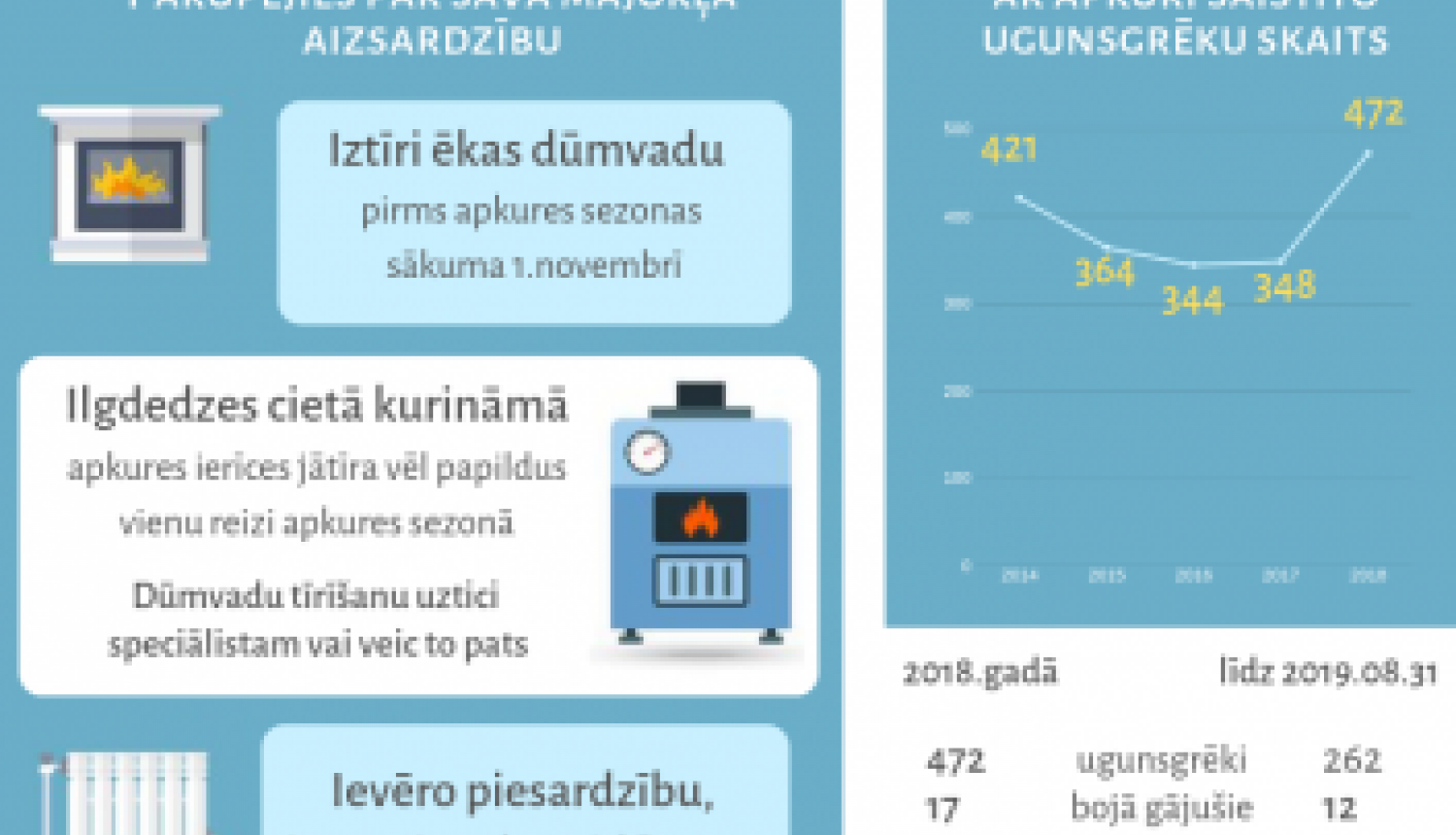 Ar apkures lietošanu saistītos ugunsgrēkos pērn gāja bojā 17 cilvēki, bet cieta 43 cilvēki. Savukārt šogad ar apkures problēmām saistītos ugunsgrēkos gājuši bojā jau 12 cilvēki, bet cietis – 21, turklāt jāņem vērā, ka šā gada apkures sezona ir tikai sākusies, tādēļ drūmā statistika visticamāk vēl tikai pieaugs. Ugunsgrēkus, kuros cieš vai iet bojā cilvēki un tiek bojāts īpašums, var novērst, regulāri veicot dūmvadu tīrīšanu un apsekojot apkures ierīču tehnisko stāvokli.