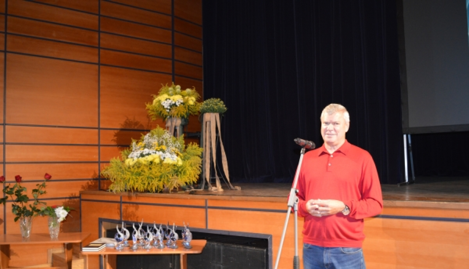 Attēlā: Mecenāts, uzņēmuma "Light Guide Optics International" vadītājs Daumants Pfafrods Līvānu novada pedagogu sanāksmē 2017.gadā.
