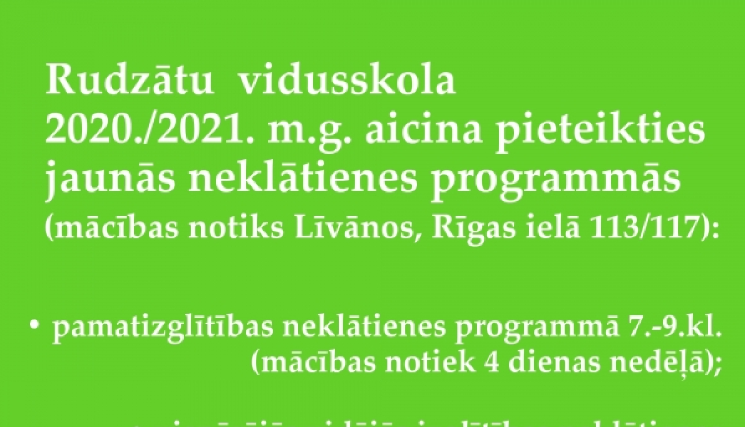 Rudzātu  vidusskola 2020./2021. mācību gadā aicina pieteikties jaunās neklātienes izglītības programmās (mācības notiks Līvānos, Rīgas ielā 113/117):