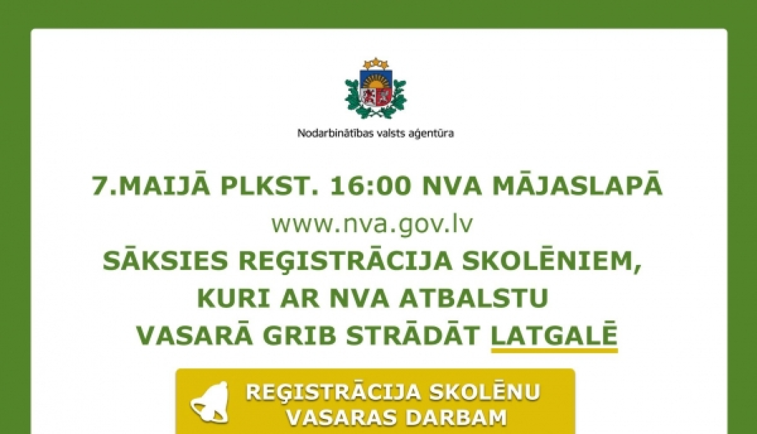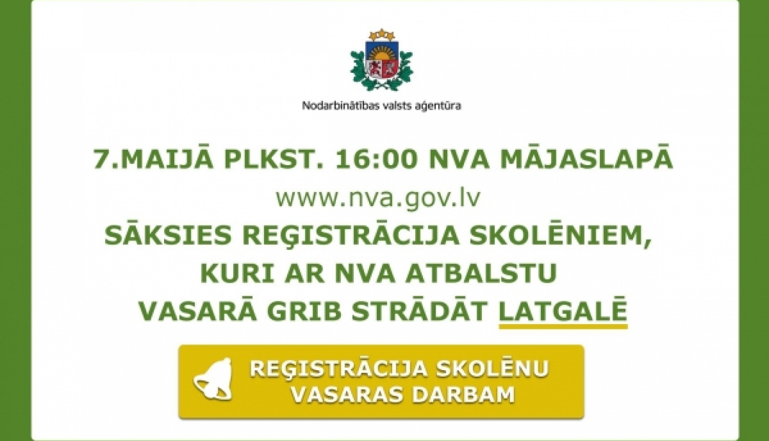 - 7. maijā no plkst. 16.00. dalībai vasaras nodarbinātības pasākumā varēs sākt reģistrēties tie skolēni, kas vēlēsies vasaras brīvlaikā strādāt Latgalē.