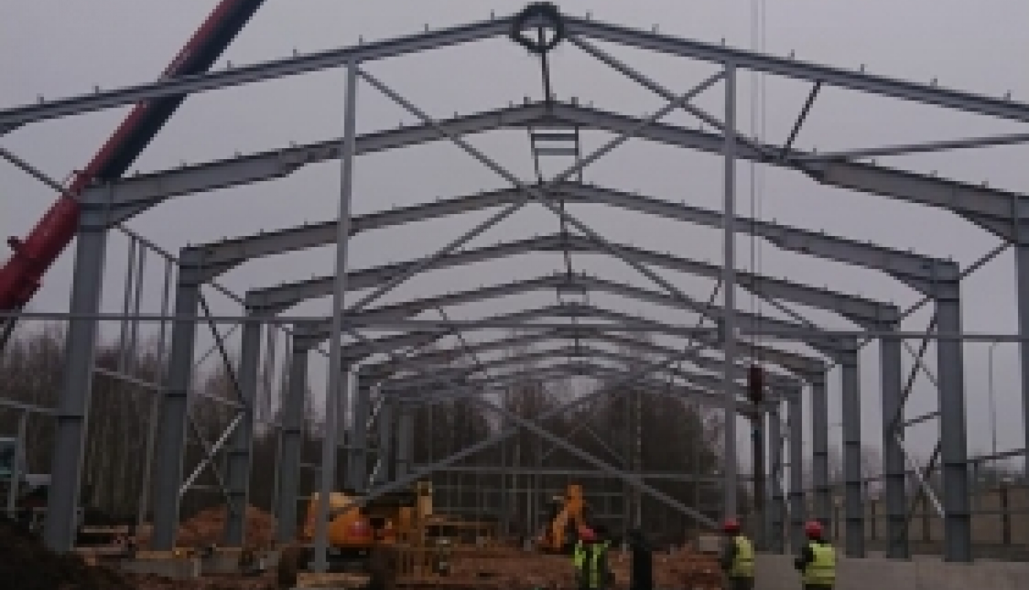 Turpinās noliktavu angāra un piebraucamā ceļa izbūves darbi Līvānu industriālajā zonā. Šodien jaunbūvējamajam angāram spāru svētki.