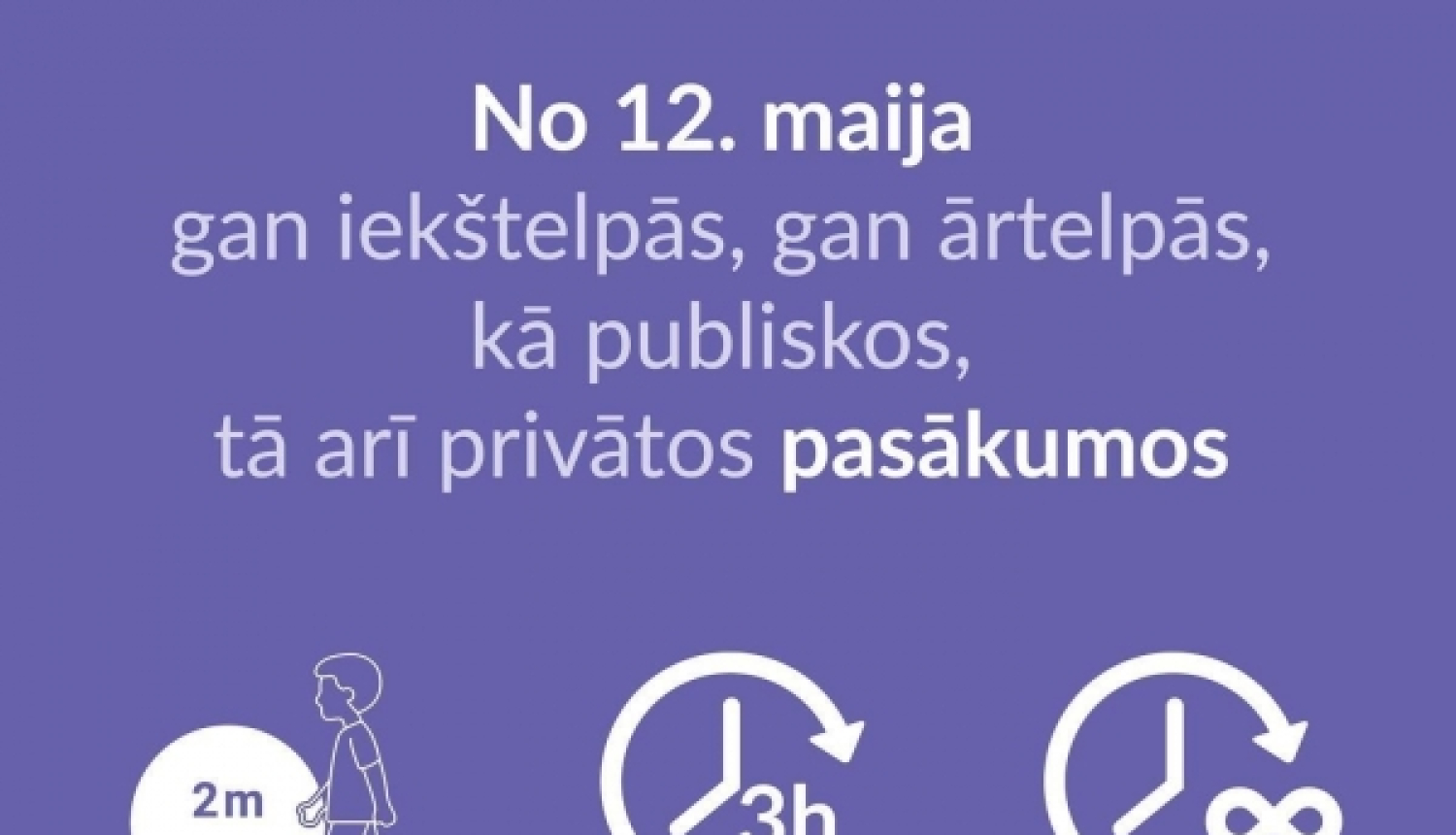 Atgādinām, ka, neievērojot divu metru distanci, vienlaikus pulcēties publiskās iekštelpās un publiskās ārtelpās var: