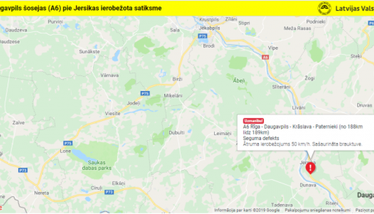 Uz Daugavpils šosejas (A6) Jersikas pagastā pie Āriņiem (188,21. km) ceļa segumā rišu padziļinājumos šorīt ir izveidojušās bedres, tāpēc atļautais braukšanas ātrums apmēram 200 metru garā joslā tur ir samazināts līdz 50 km/h. Bedru vietas ir norobežotas ar vadstatņiem. Viena no bedrēm jau ir aizlāpīta, tiks labota arī otrā bedre. Satiksme notiek pa abām ceļa joslām.