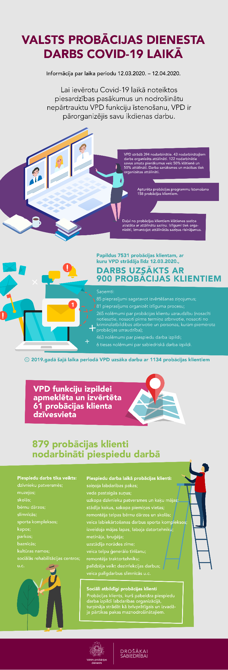 Valstī izsludinātās ārkārtējās situācijas laikā darbs ar probācijas klientiem/apmeklētājiem lielākoties notiek attālināti, sazinoties pa telefonu/sarakstoties e-pastā un/vai WhatsApp, taču ir probācijas klientu kategorijas un apmeklētāji ar kuriem notiek tikšanās klātienē. Kriminālsoda – piespiedu darbs – izpilde tiek nodrošināta iespēju robežās, noteiktā kārtībā VPD uzrauga nosacīti notiesātās, nosacīti pirms termiņa no soda izciešanas atbrīvotās, nosacīti no kriminālatbildības atbrīvotās personas un personas, kurām piemērots papildsods – probācijas uzraudzība.